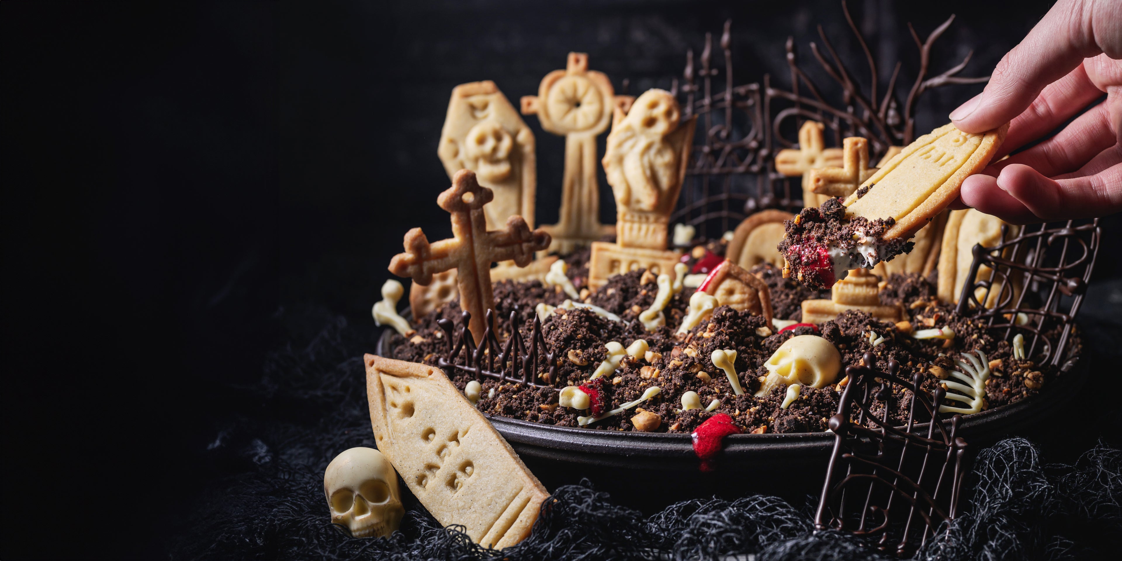 This is such a fun Halloween treat to make and so devilishly yummy. It will keep everyone entertained as they scoop up delicious mouthfuls of soft vanilla cheesecake, crunchy chocolate cookie crumbs, and pops of fresh raspberry with their chosen biscuit gravestone. The chocolate ‘soil’ has some lovely added salt and nut textures and surprise white chocolate bones to hunt for - I'm partial to a femur, though a skull has a good mouthful of chocolate.