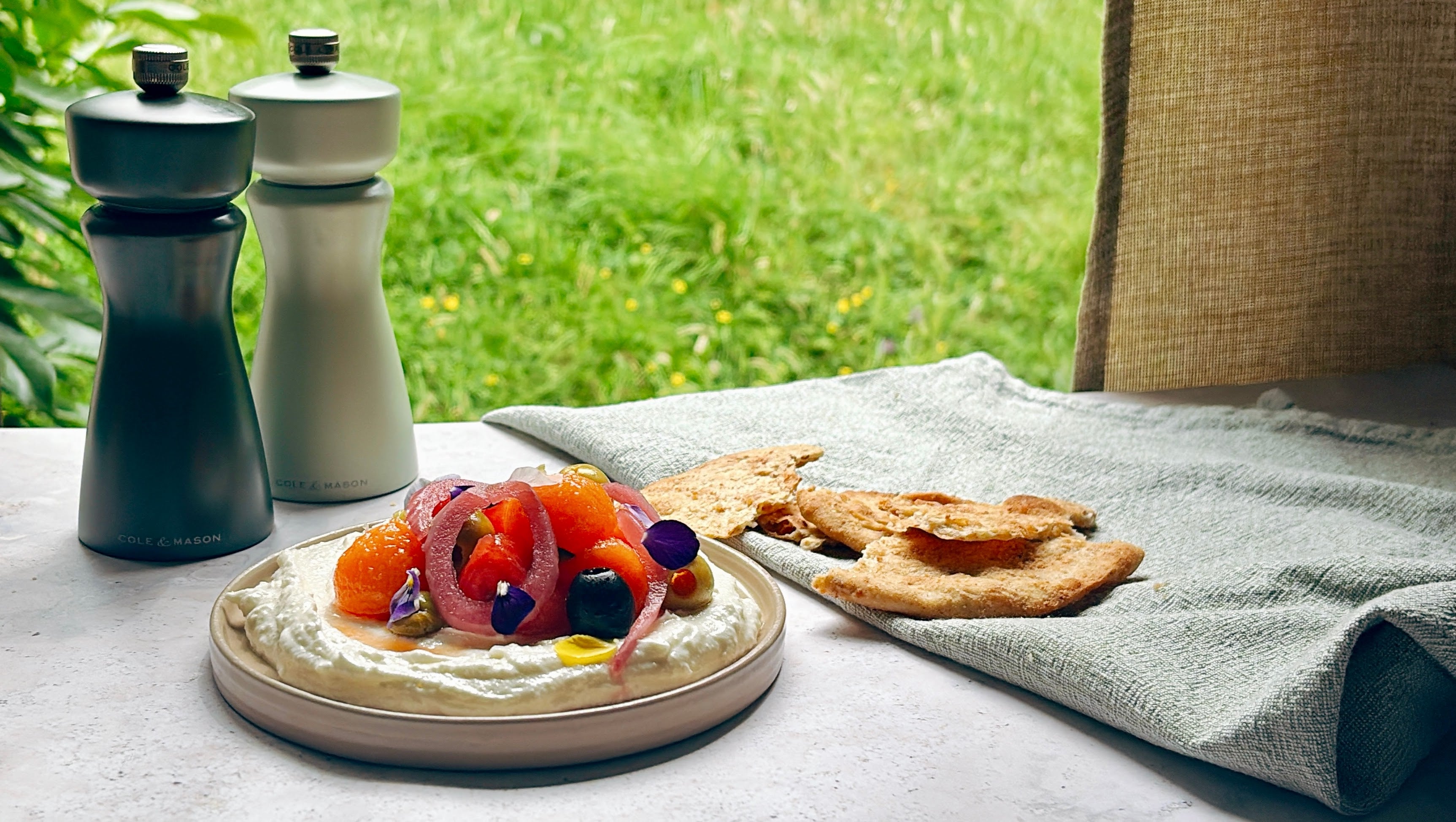 - Arrange and Garnish: On each plate, place the feta in the centre and using the back of a tablespoon, spread this to the edges and create some space in the centre. Start by placing the melons and add your additional garnishes of pickled red onions and edible flowers for an extra summery touch.