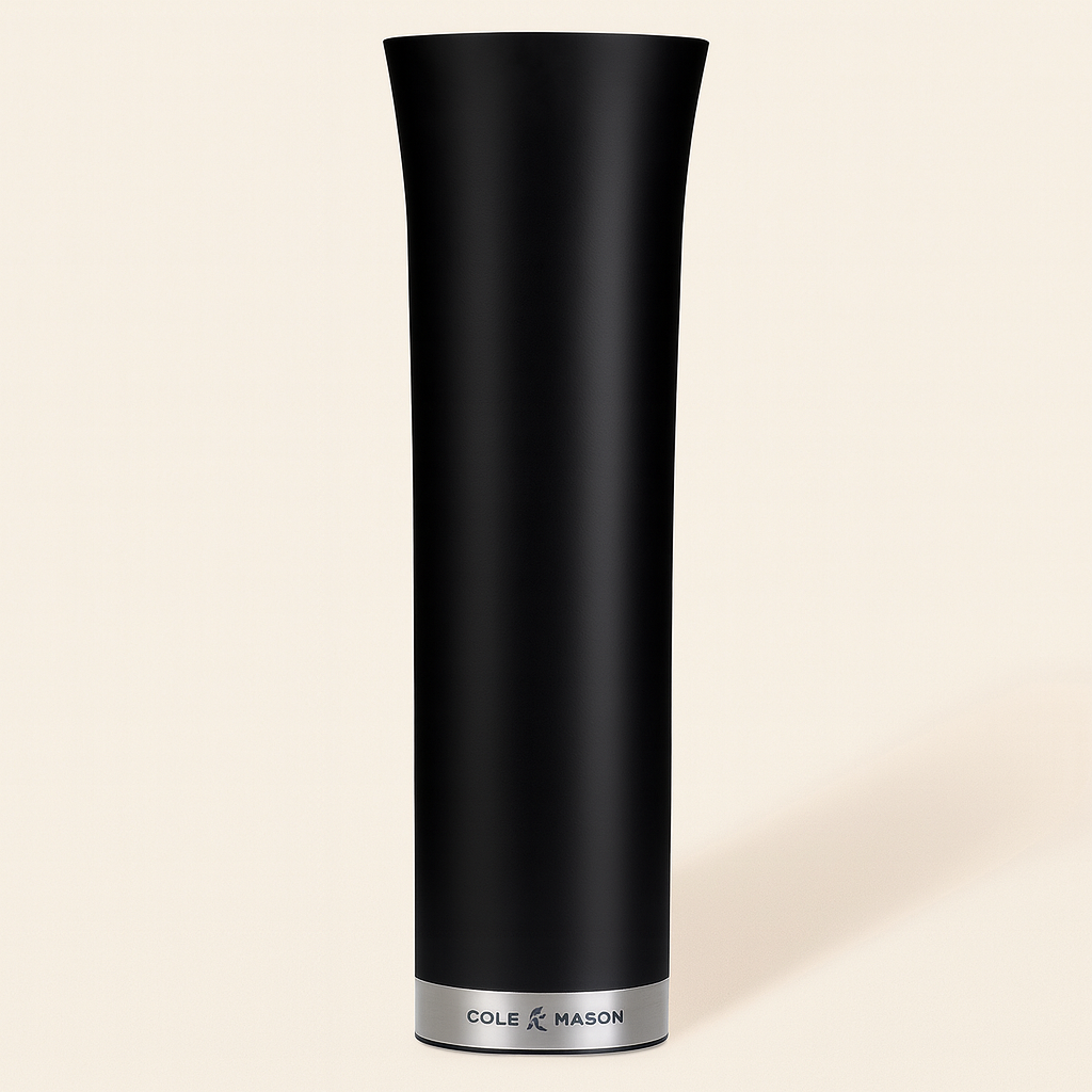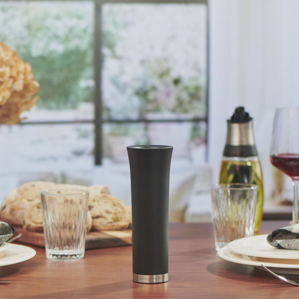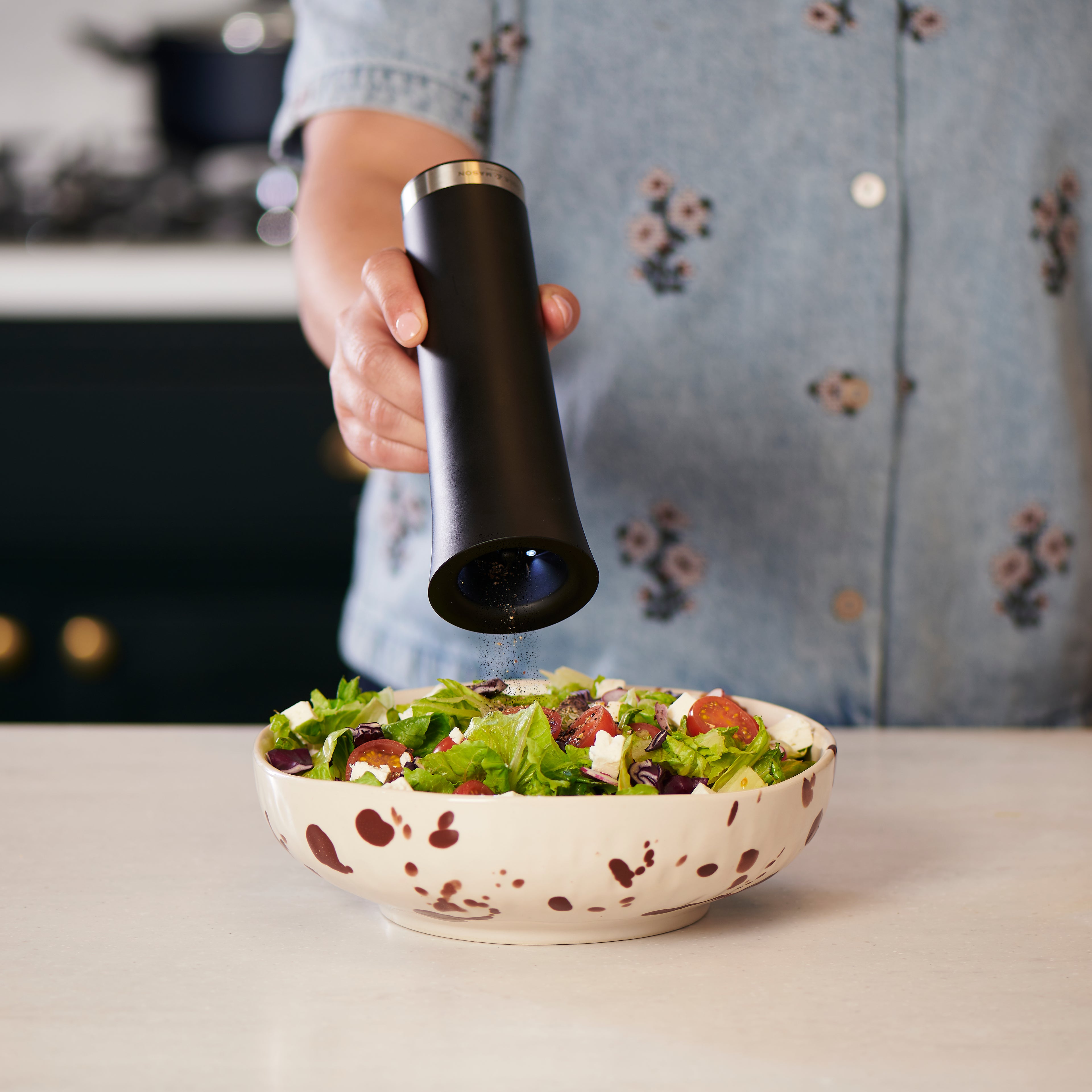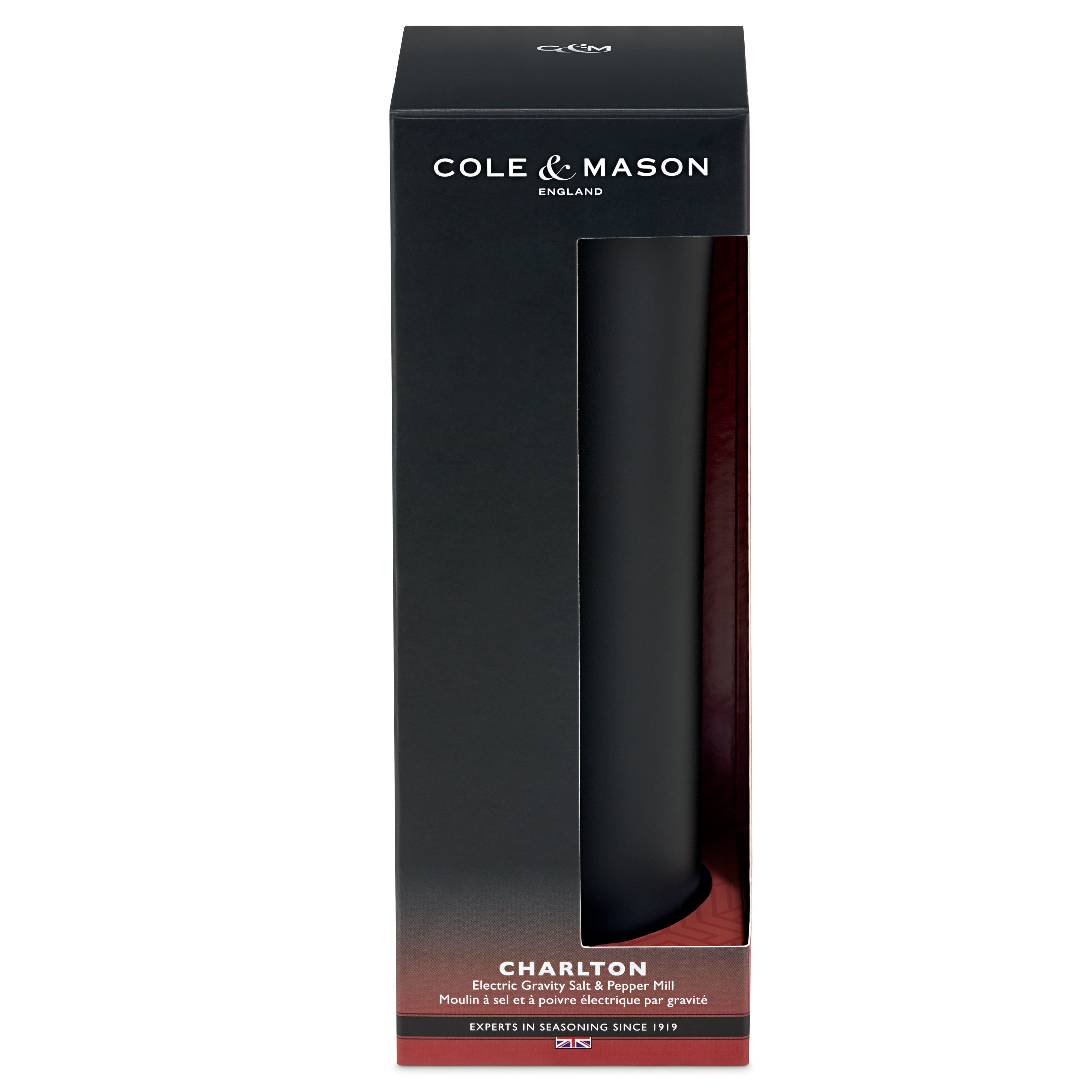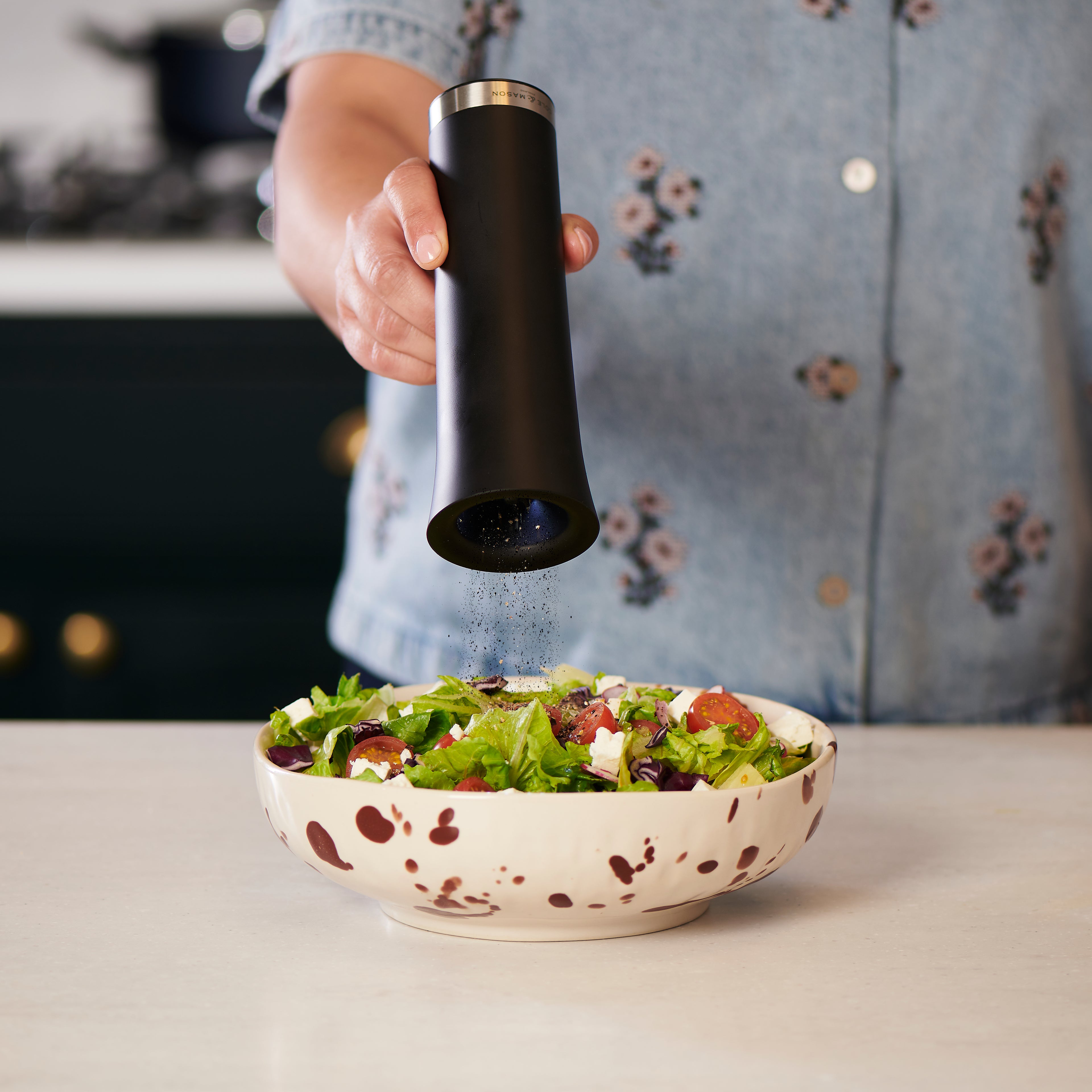 Standing 7.5 inches tall and finished in matte black, this smart mill uses gravity-activated technology for single-handed ease—just tilt to activate. An integrated LED light illuminates the area beneath the mill, making it easy to season accurately, even in low light. It's fitted with an ultra-sharp ceramic mechanism to deliver consistent performance for both salt and pepper. The adjustable grind setting lets you customize your seasoning from fine to coarse with a simple twist, while the easy-fill design ensures minimal fuss. Powered by 6 AAA batteries, the Charlton is a must-have for modern cooks who value convenience and style.