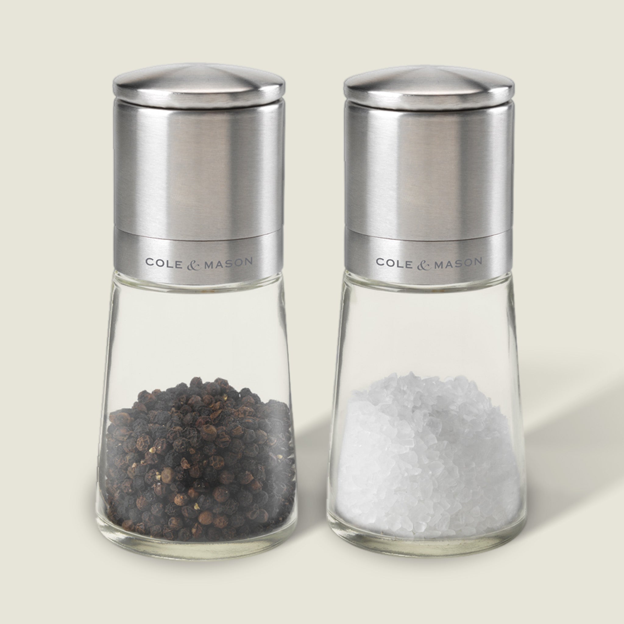 The Cole & Mason 6 inch Clifton Salt & Pepper Mill Gift Set, top grinding, pairs elegant satin metal and glass design with the renowned Cole & Mason Precision mill for the perfect table setting. Every Cole & Mason Clifton peppermill is made with precision-crafted carbon steel millworks for years of service, and salt grinders feature diamond-cut ceramic millworks. Mill chambers are clear for display and refill is a snap by unscrewing the top to open. The chamber is heavy glass that will last. Set the perfect grind and flavor from fine grains to coarse chunks by adjusting the dial setting inside the lid. Clifton sets are gift boxed and make a great wedding, housewarming or holiday present.